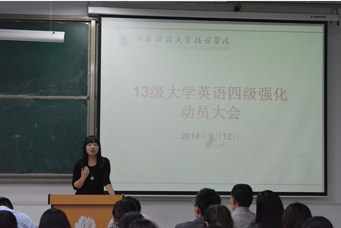 黄老师强调,在过去一年中,镐京学院12级全体师生在学院精心组织、年级部的统筹安排、各班主任和任课老师的协调配合以及全体学生的努力学习下,取得了四级一次性通过率85.03%-历史第二新高的优异成绩。为了吸取经验,再创新高,黄老师公布了13级大学英语四级强化计划,指出,本学期的英语教学要以“新核心为基础、专项能力为突破和真题模拟为依托”的原则进行,并更加细致了安排了本学期的教学任务和考前突破计划。